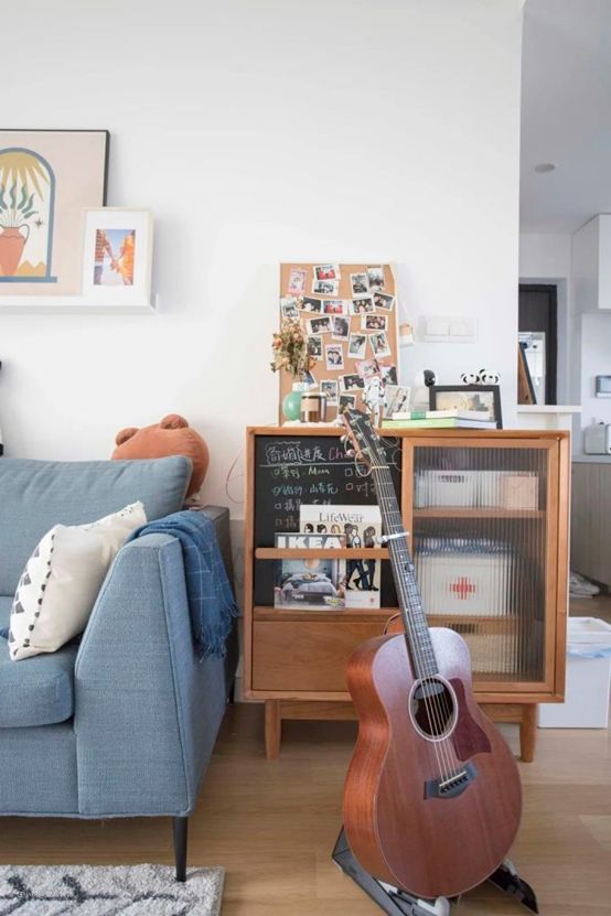 不止边柜前的吉他,对面电视机旁边也还有两把琴,除了音乐,两人在家的娱乐还会在小米55寸的电视机上玩游戏机。