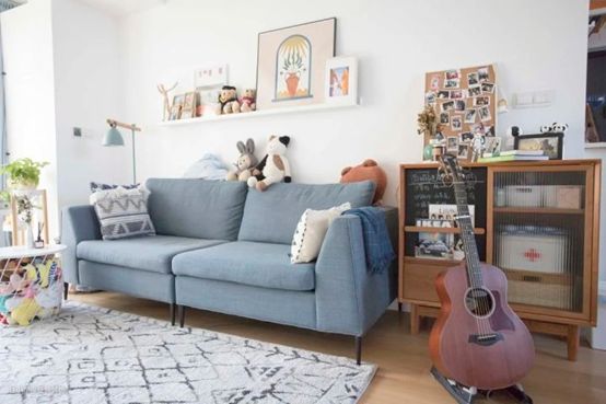 客厅是Julia和小猫最常待的活动区域,所以不需要大茶几放在沙发前方,尽量保留足够的空间,可以坐在地毯或者沙发上休闲娱乐。