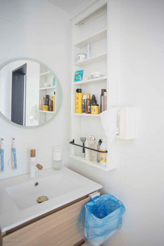 卫生间做了干湿分离,干区的空间比较局促,但刚好能配下住范儿套餐内尚高的小确幸浴室柜,原来Julia挺担心干区的收纳空间不够,但这个浴室柜超出了预期。