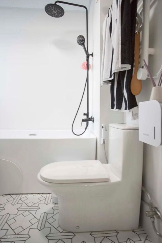 卫生间一开始想同时满足浴缸泡澡和淋浴洗澡的功能,但还得塞下马桶和洗衣机,空间不太够,只能妥协站在浴缸里洗澡。