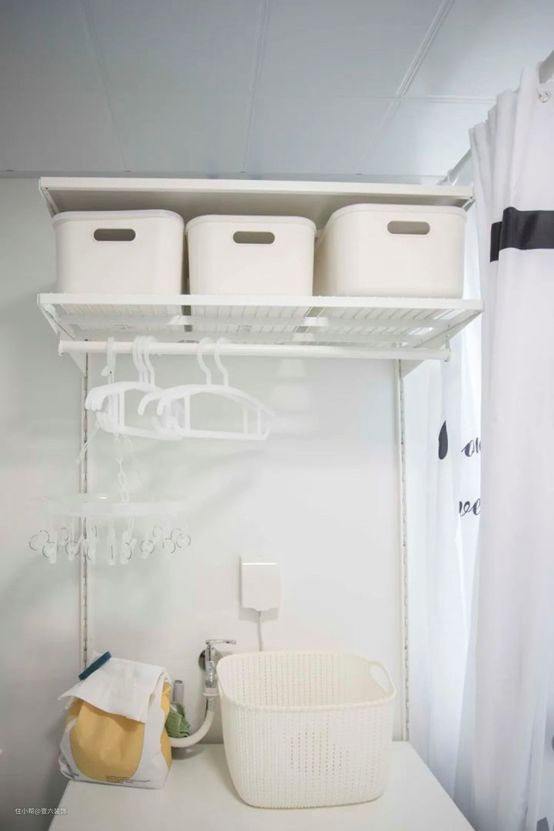 洗衣机上的架子也是宜家的博阿克塞系统,可以自己购买组件轻松打造出适合使用习惯的个人储物解决方案,整齐的收纳洗涤剂、脏衣物和准备晾干的干净衣物。