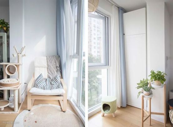 细腿的电视柜没有落地电视柜的笨重感,靠近阳台的展示柜,摆放着一些盲盒摆件,旁边就是小猫的猫爬架。