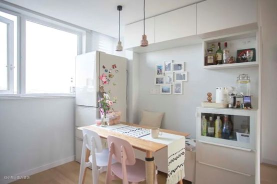 稍微有点可惜的是,冰箱背后的一小根水管也没办法拆除,只能凸出墙面一点点,在前面放冰箱,整体的利用率最大化提升。