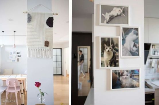 Julia在柱子上挂了一些小装饰,不会显得单调沉闷,一侧是小挂毯,另一侧是家里两只小猫奥利奥和牛奶的成长照片。