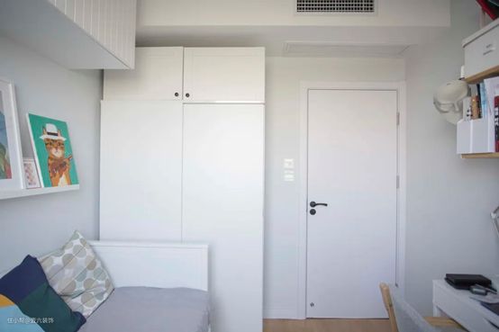 最后通过宜家的汉尼斯坐卧两用床、双人书桌、墙面储物柜和靠近门边的薄衣柜,把想实现的功能能实现了,小空间的极致利用术。