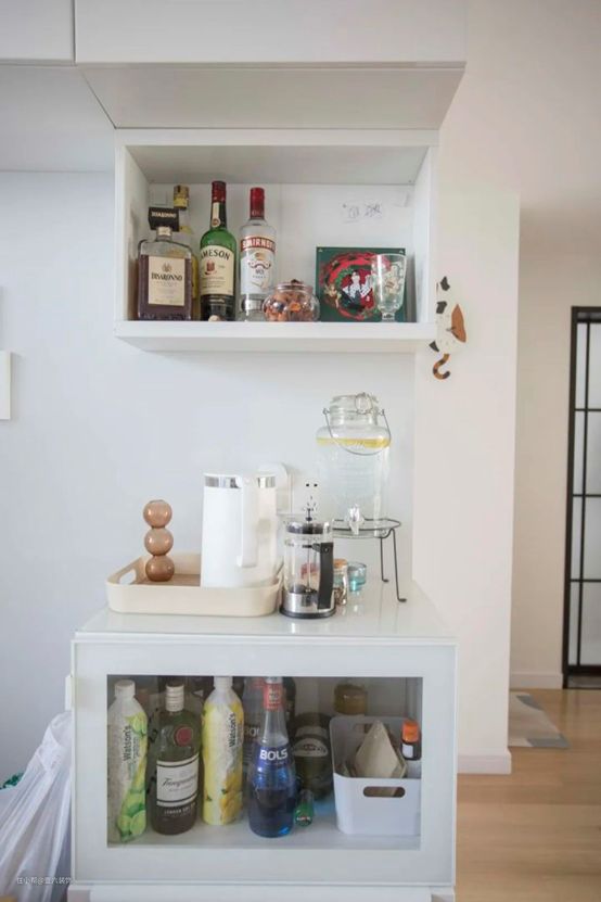 Julia平时喜欢自己在家调酒,所以餐边柜变身小酒柜,收纳一些酒和杯具器皿。