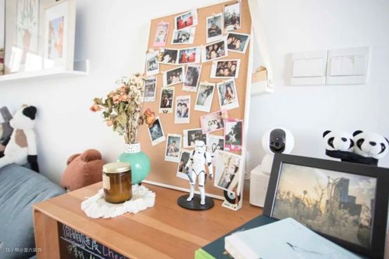 边柜上方是软木板做的相片墙,c先生经常给Julia拍照,家里朋友来玩的时候也会拍一些合影留做纪念,所以家里随处可见很多带着快乐回忆的照片。