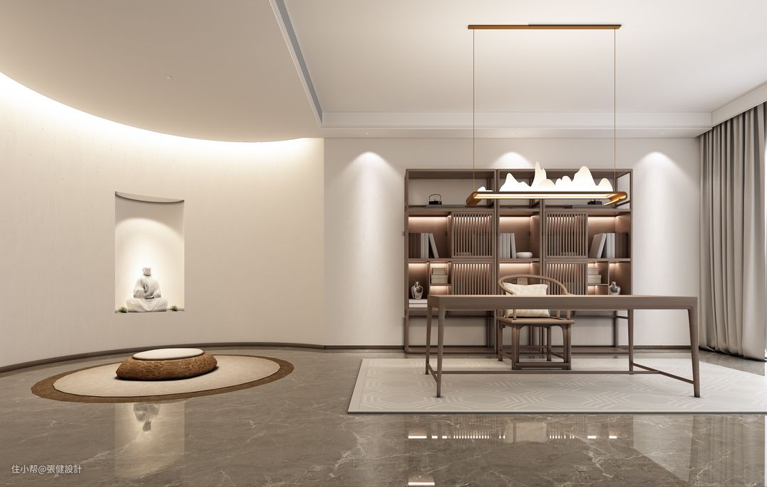 空间的整体色彩为主角,做细格栅接出圆弧包覆,弱化了空间因挑高而带来的孤寂。禅意的清境在空气里绽放,自然朴实色系放大了禅的圆融。