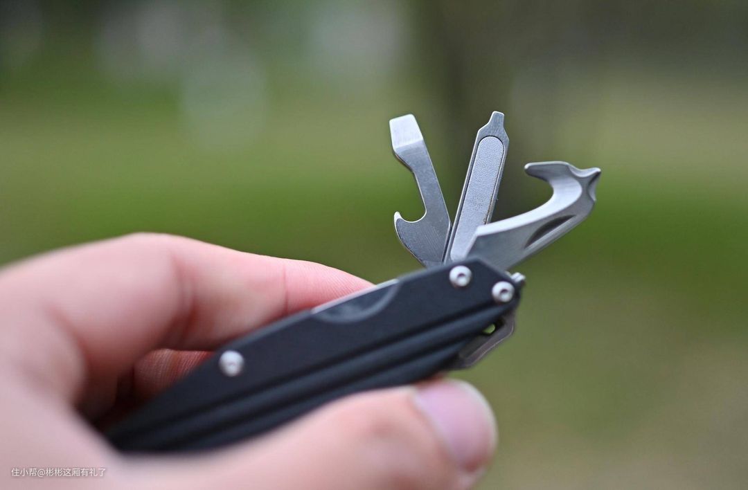 ▲除了小刀,还有很多功能!给啤酒开个瓶盖、打磨指甲、锯木头(这个锯子好用,有锁定装置,不怕折叠)、切割条状物(钩形刀口)都不在话下。而且放在车里还有一个好处,小刀一头有击锤,可以在紧急时刻破窗。