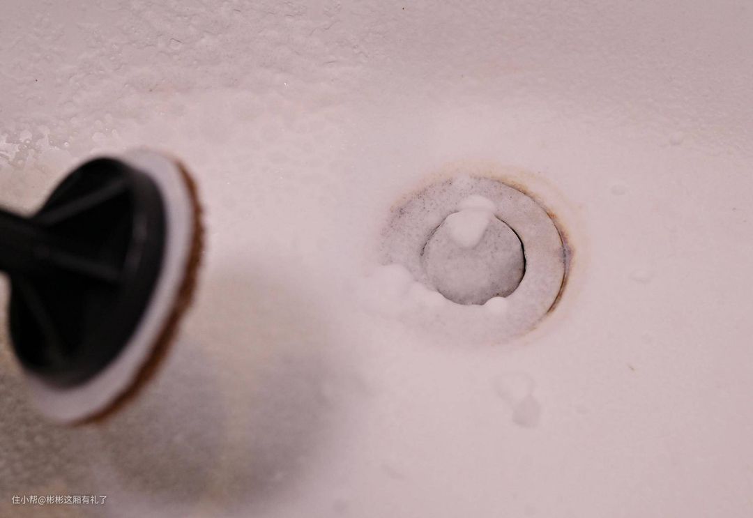 ▲两次成功的清洁经验让我有点小膨胀,尝到了劳动果实香甜的味道,于是继续全屋搞卫生。话说洗手池也好久没好好清洁了,白色池子有点脏,关键是下水口位置有点锈迹斑斑,一般毛刷还真不好清洁。清洁过程不多赘述,请直接看结果吧(tips,棕色毛刷硬度确实硬,可能会伤到五金,请慎用)。如果家里有浴缸,魔洁先生是少不了啊。