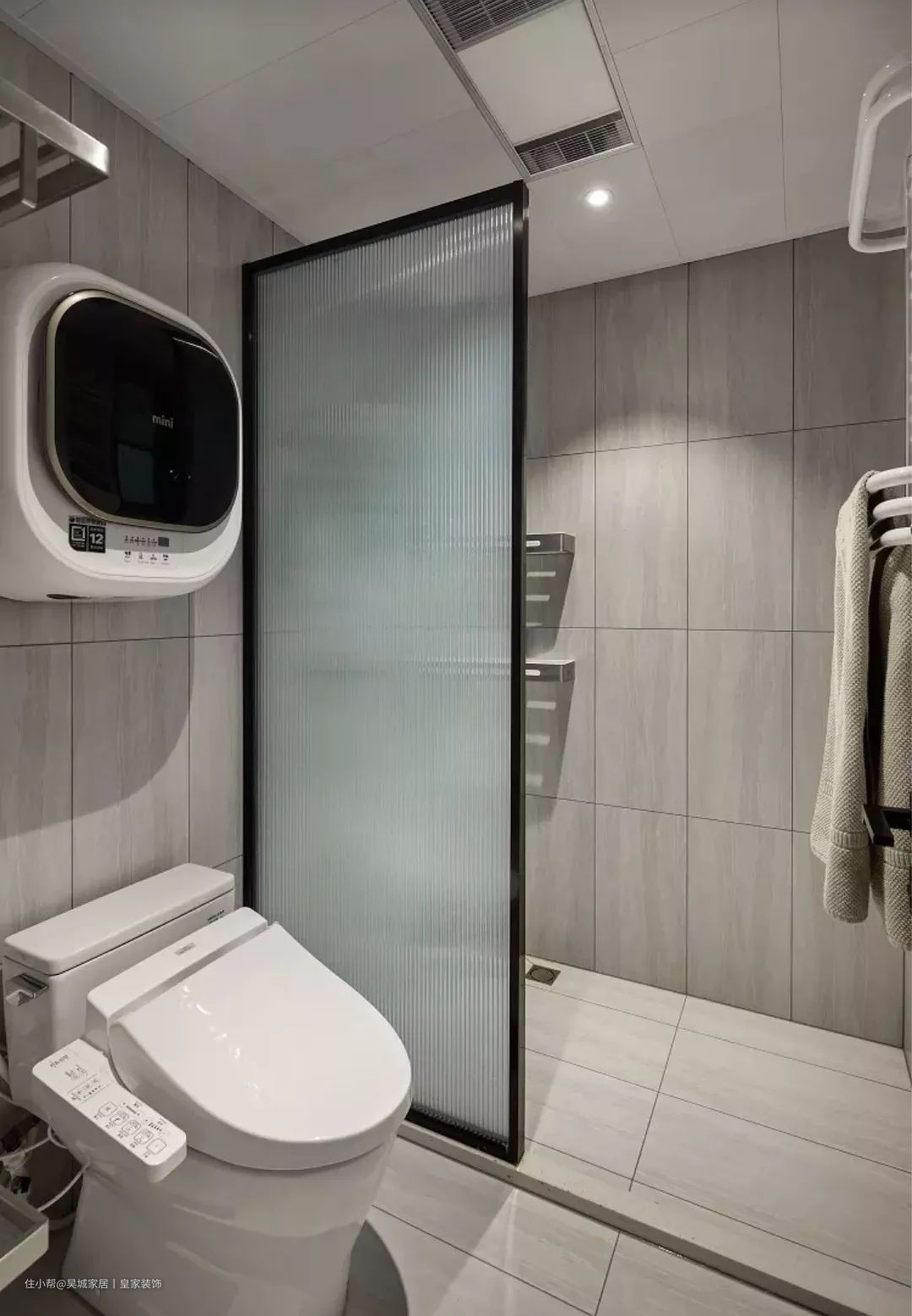 卫生间隔断三 根据卫生间高度。普通家庭卫生间的吊顶基本在两米四左右,所以高度的话在1米8到2米。但如果您家有身高较高大的成员,这个高度就可以根据家人身高来设计。