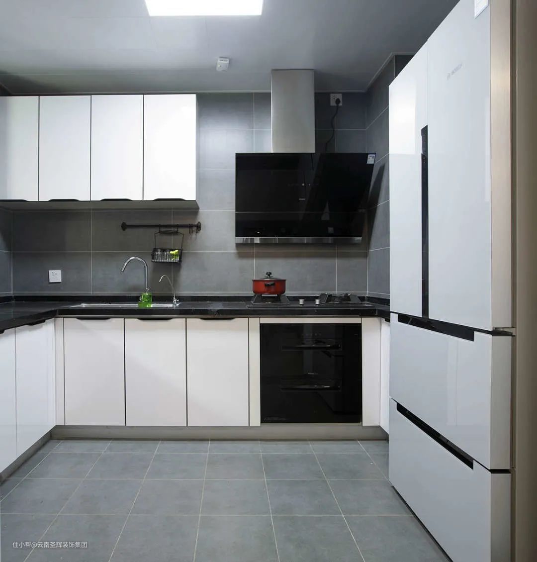 家里的厨房很大,妈妈对厨房的要求就是好打扫卫生,干净整洁,因此墙面和地面都用了水泥色瓷砖。橱柜就用了造型极简的白色平门橱柜,让厨房显得干练、整洁又充满现代气息。