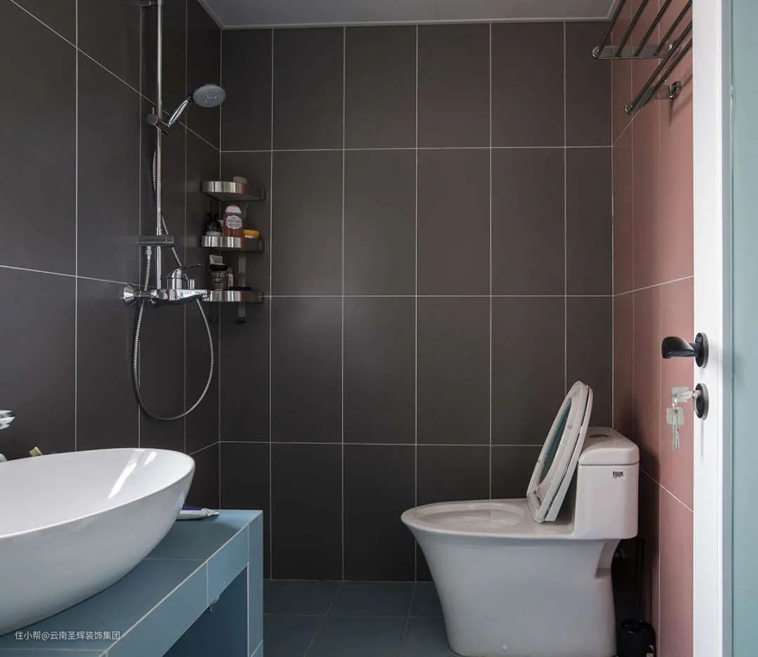 话说卫生间的三色墙砖搭配是来自业主的想法,因为在逛瓷砖市场的时候看到各色貌美的瓷砖,所以就跟设计师建议能不能把不同颜色拼在一起,出来效果也美美的。特别要说的就是地砖是专门为最爱的妈妈选的,因为妈妈喜欢大海的颜色,所以地砖与砖砌洗手台都用了海蓝色。