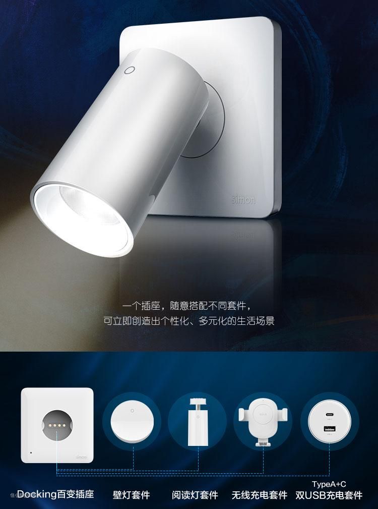 一个docking插座可以匹配壁灯、阅读灯、无线充电器、USB插座四种功能套件,3.9秒完成套件装卸,方便又好用。