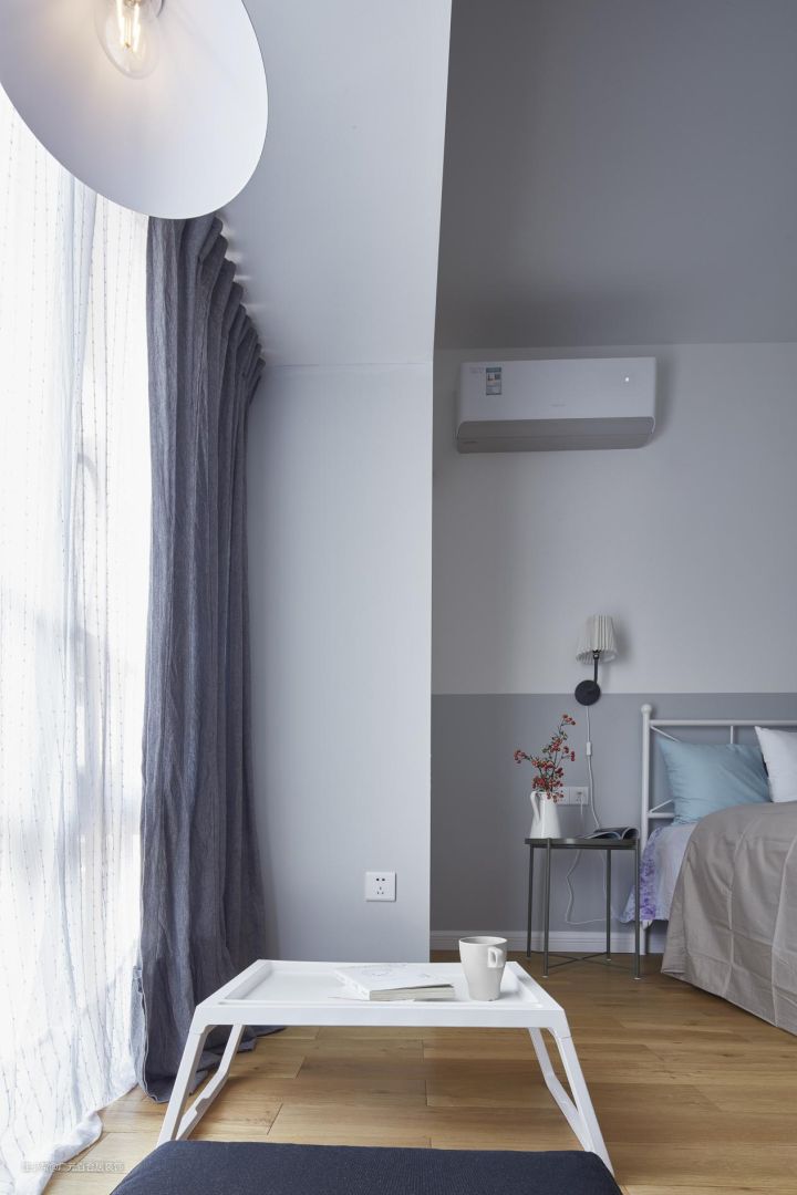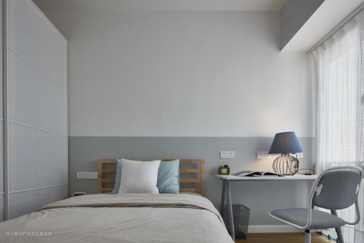 次卧灰色的床头背景墙没有多余的装饰,床边的书桌靠墙放置,充分利用墙面空间。