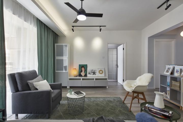 造型简约的灰色沙发上摆放着靠枕,墨绿色的地毯铺在木地板上,增加了客厅的层次,简约大方的沙发椅能提供舒适的触感,屋顶安装着设计巧妙的吊扇灯,吊扇灯、射灯、灯带共同带来富有变化的灯光。