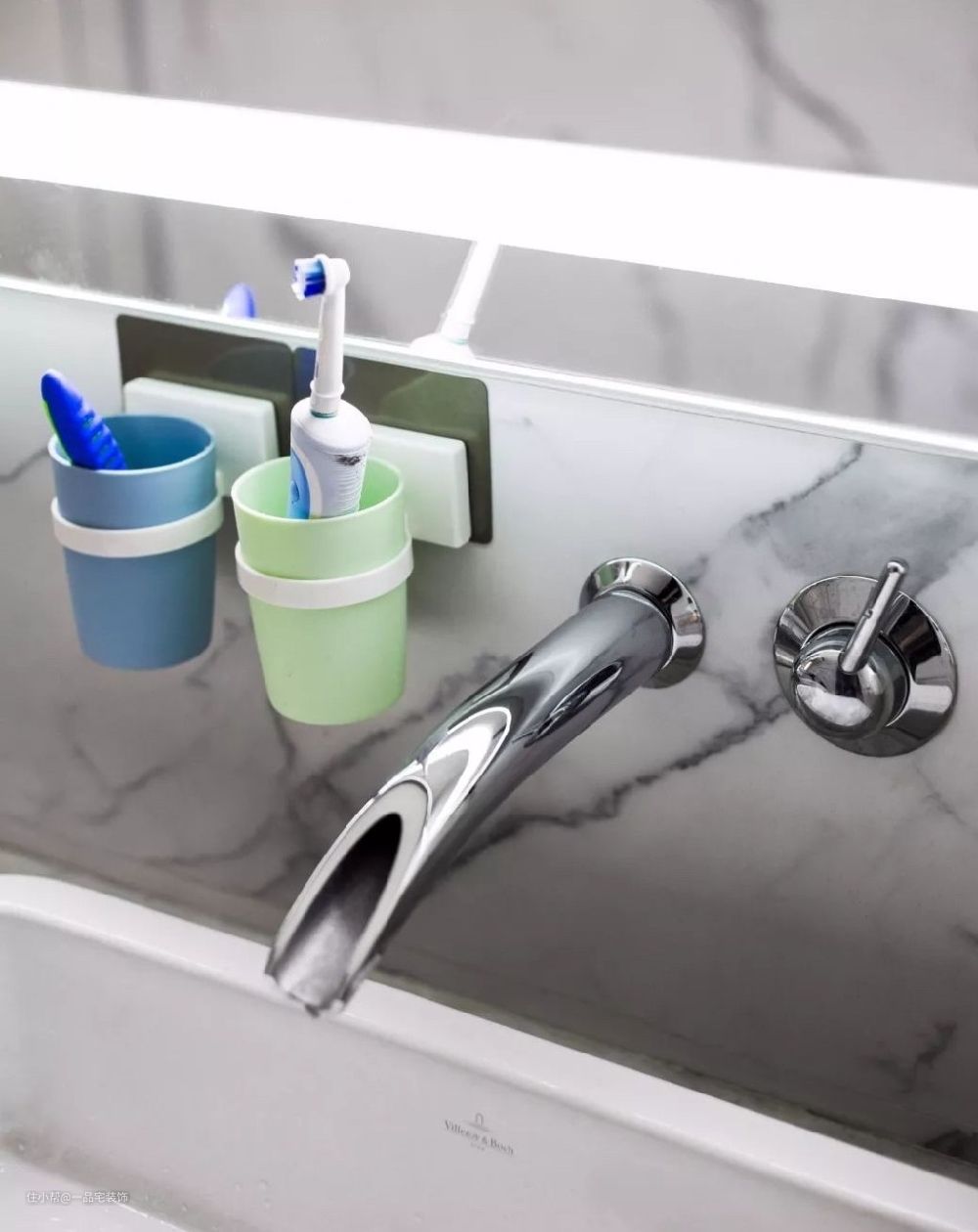 玄关是个小小的凹形空间,在白色大理石地砖基础,刚好装了个L形的黑色鞋柜,并布置了灰色与蓝色的换鞋凳,黑白配的基础加入灰与蓝,显得时尚简约自然