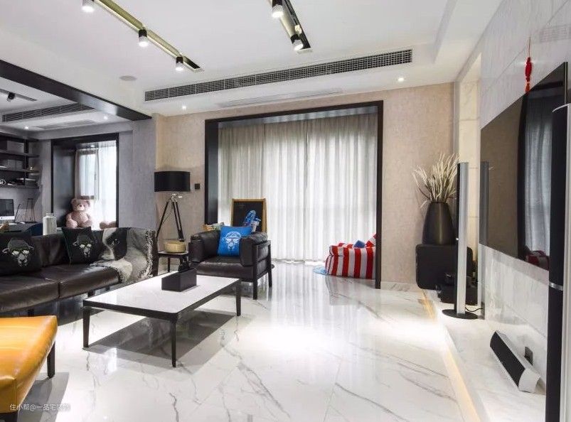 大理石质感的电视墙与地面保持统一的质感,两侧做了内嵌的造型,搭配黑色的电视机与音响,形成一个独特的黑白配时尚