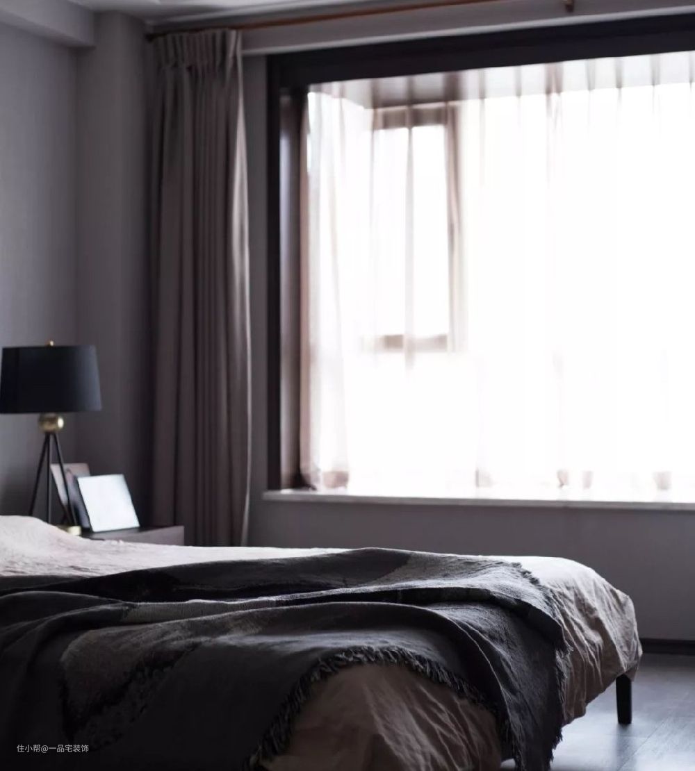 窗帘装在飘窗里侧的靠墙位置,平日飘窗可以是个休闲放松的小地方