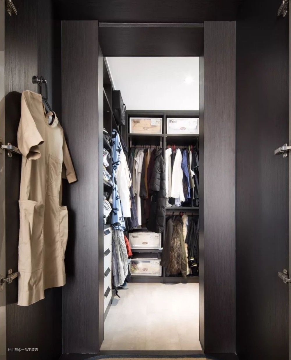 打开这个“衣柜门”,其实是内有乾坤,里面是个步入式的衣帽间,提供了充足的衣物储存空间