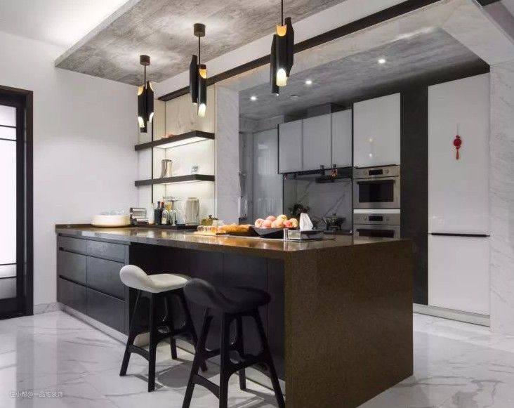 开放式的厨房,有着宽敞的操作台空间,白色柜体与地面,天花是灰色的吊顶,整个空间显得简约而优雅