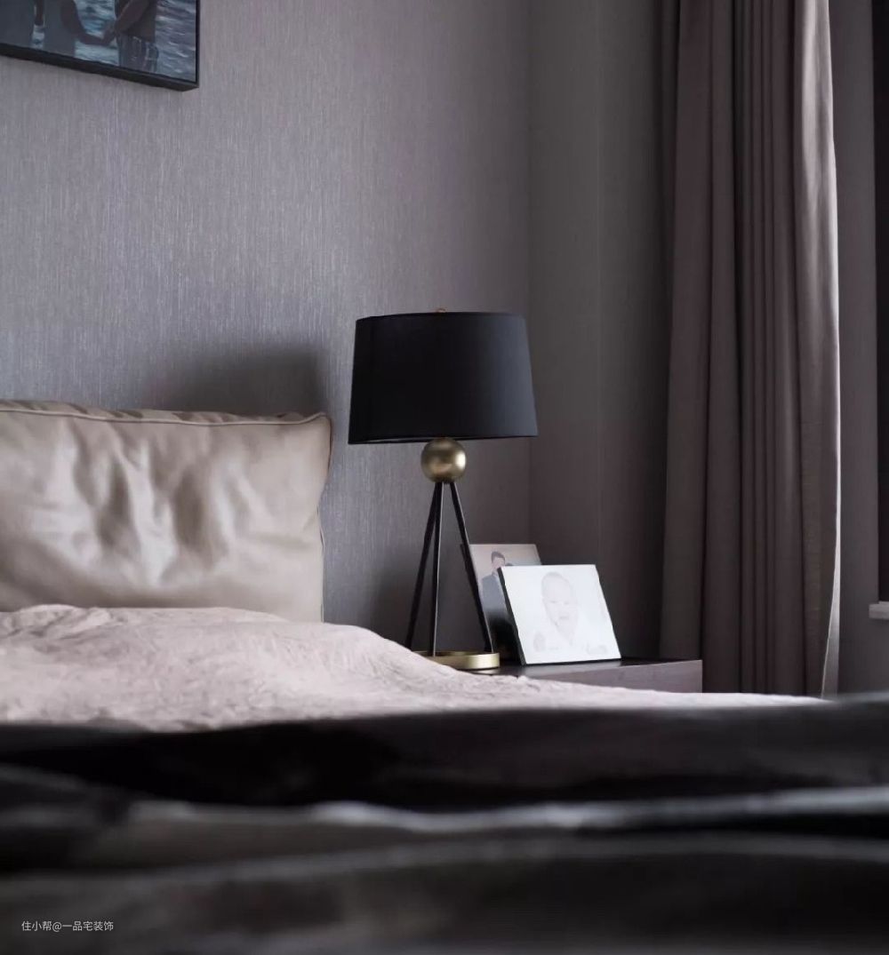卧室在现代舒适的空间基调下,床头背景墙挂上一家三口在海边拍下的背影照片,充满了自然的温馨感