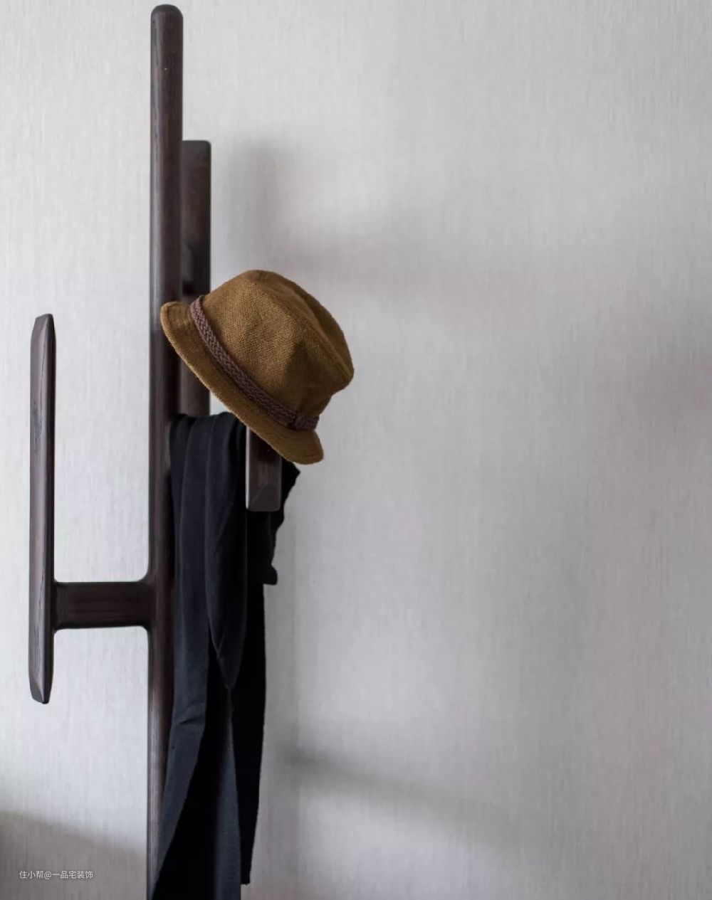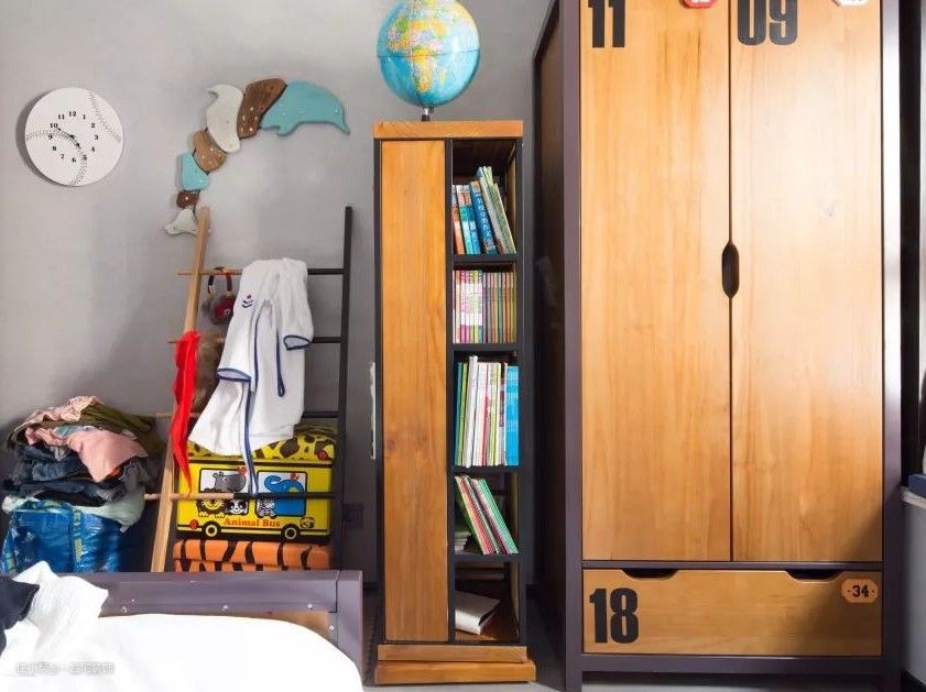 床尾处的衣柜+书架与挂衣架,小面积的卧室,在保持空间通透的基础上满足应有的收纳储物功能