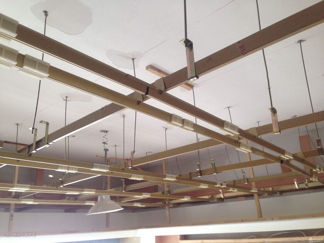水管电线:天花板上的水管电线不像墙地面,可以开槽铺设。天花板上的电线铺设,一般是剔一个小小的槽,穿黄腊管走线。虽然能保护电线,但后期换线会非常麻烦,散热也不会很好。