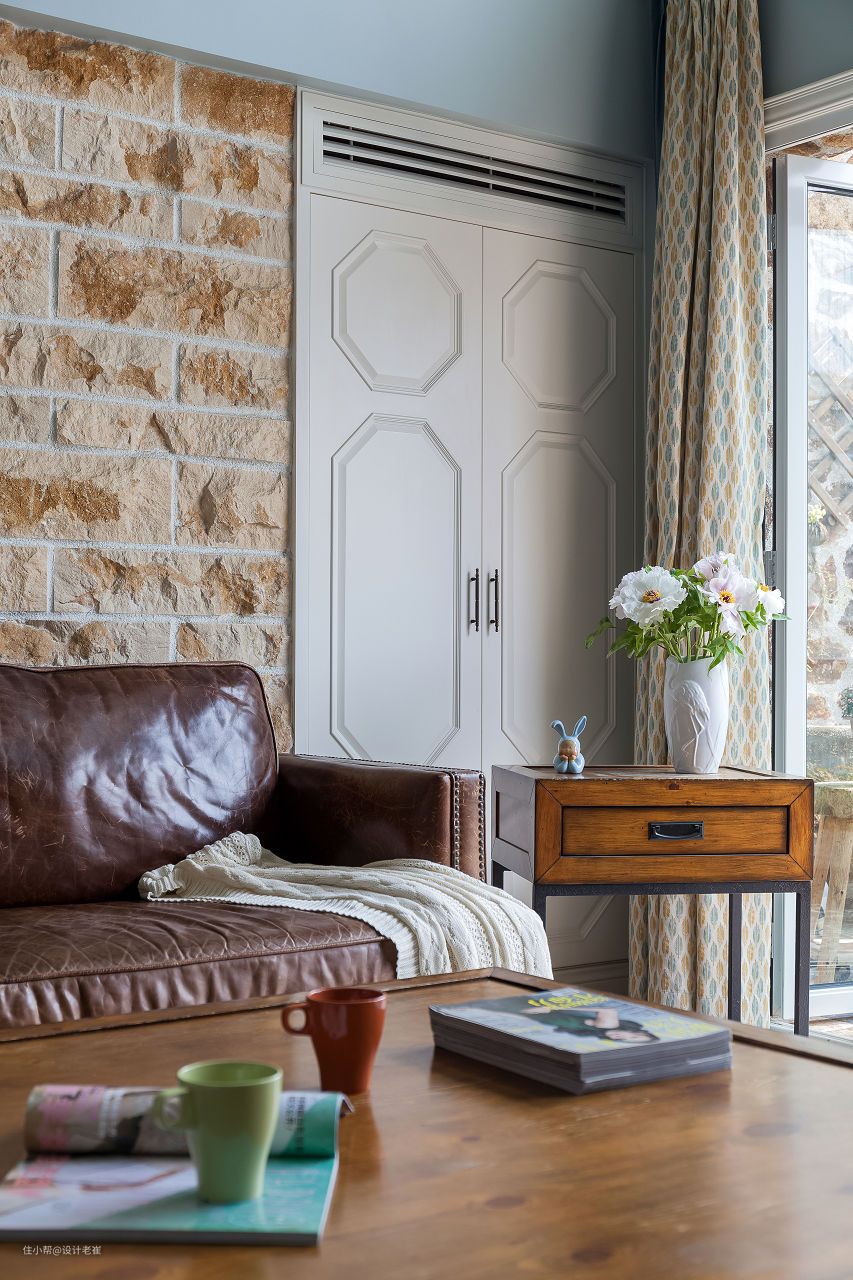 客厅空间中不同材质之间的冷暖对比调和了色彩的平衡,坐具选用了深棕色系的油蜡皮沙发和原木茶几,在同色系的不同质感间是材料之间的相互碰撞,每一个物件的质感在细节中展露无遗。 沙发背景墙靠窗位置,有一个有点鸡肋的异形暗位空间,将此空间巧妙的变为小储藏间。