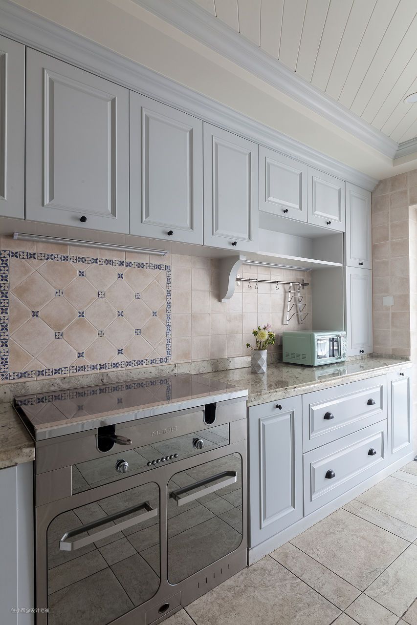 灰色橱柜搭配暖色调仿古砖,蓝色的小碎花砖作为点缀,整体色彩和视觉简洁明快。过道直线的动线规划使用起来有充足的活动空间,操作过程清晰流畅,便于放置厨房用品与用具。二人共同下厨也不会显得空间拥挤,反而互动起来温馨爱意乐趣无穷。