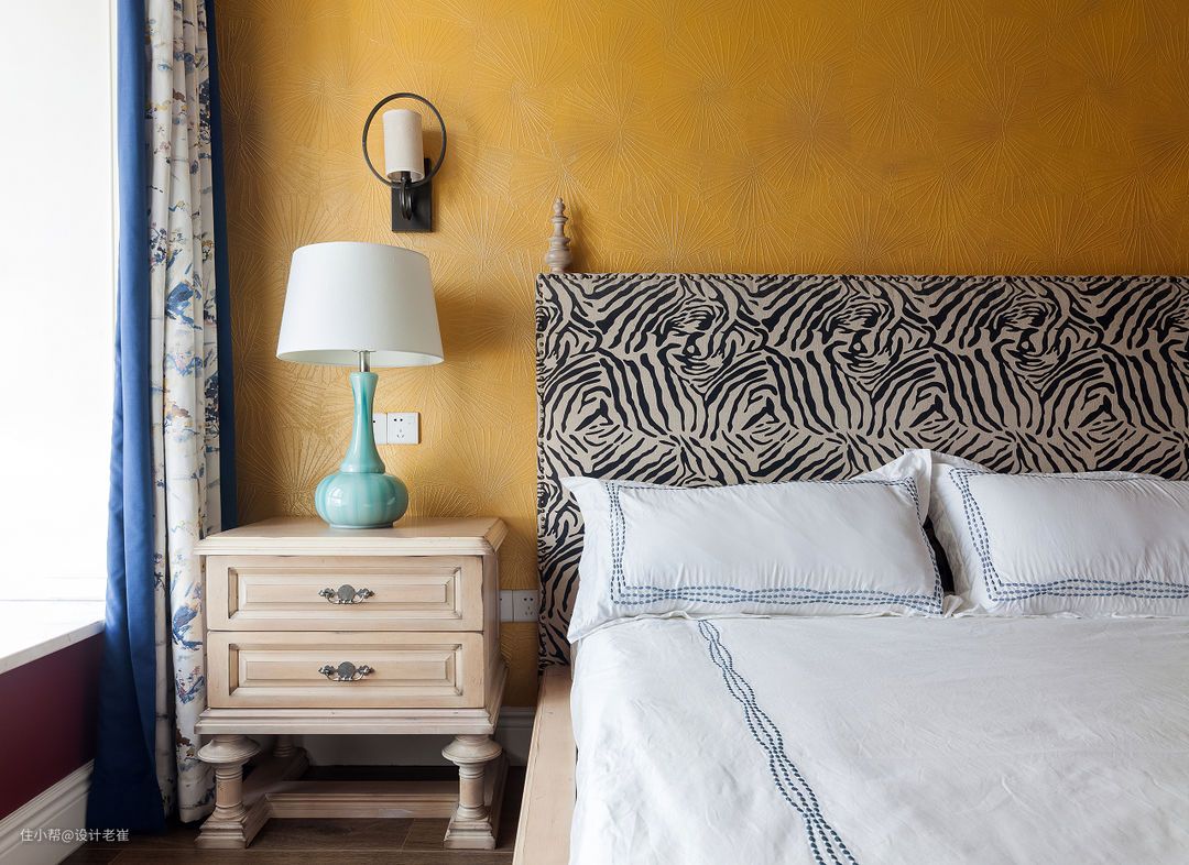 主卧整个空间的基调是暖色调,墙面运用海基布和墙漆两道工序配合完成,海基布可以给墙面更多丰富的肌理和造型,着重呈现凹凸肌理质感,墙面色彩看似单调却不单一。