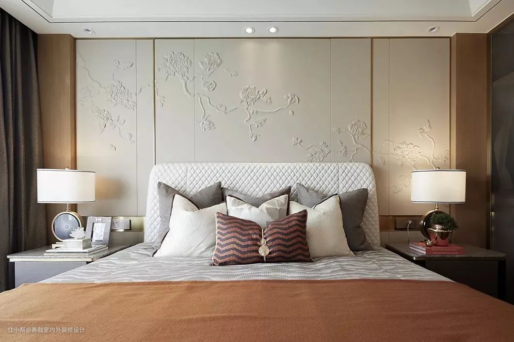 ▲卧室床头墙以硬包带花鸟浮雕图案的背景设计,布置上淡雅舒适的皮艺床,对称布置的床头柜设计,简单的布置而不失温情的雅致气息。