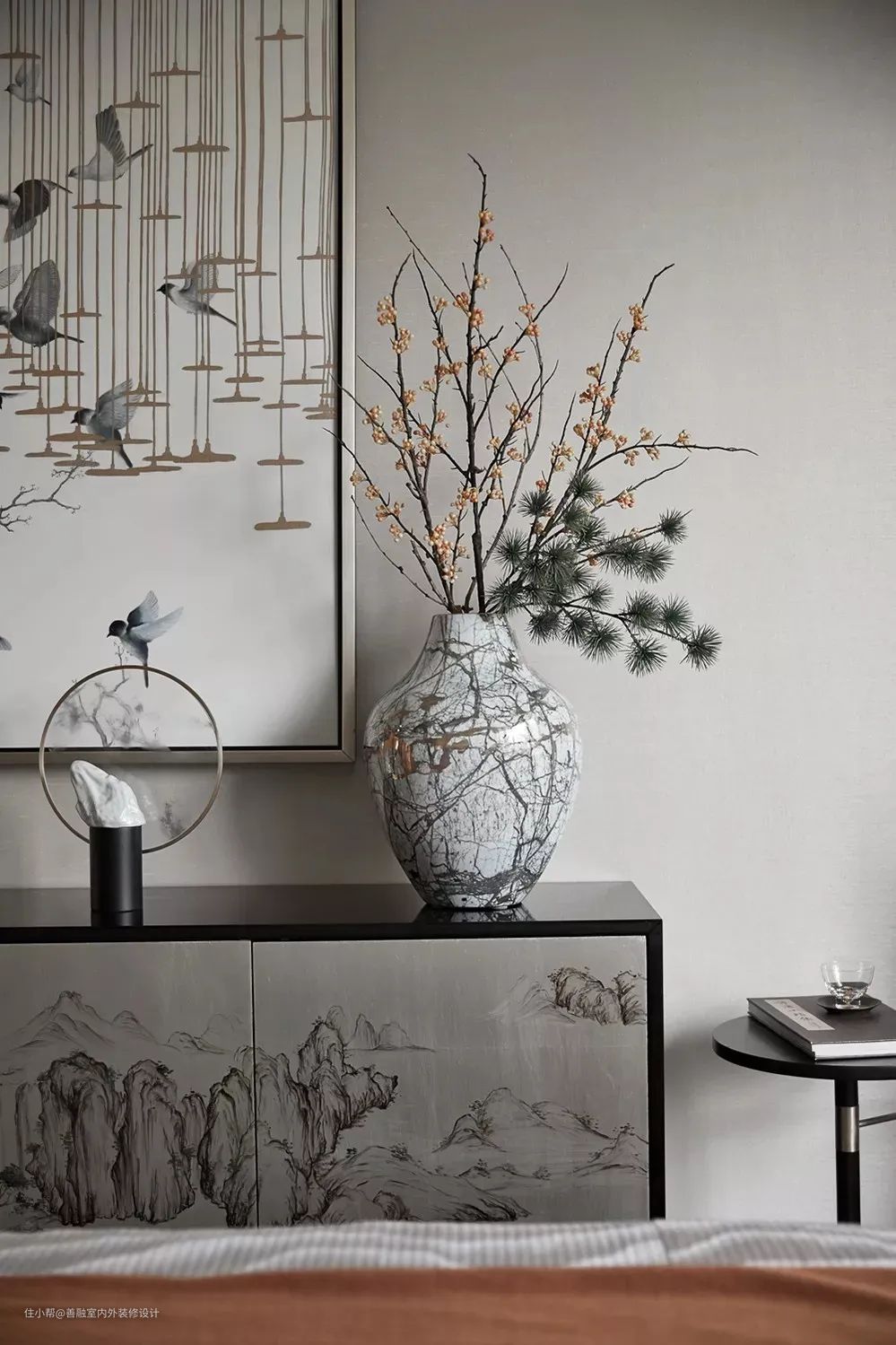 ▲床尾处的斗柜,也是带有层峦叠嶂的装饰图案,上方花鸟挂画与禅意优雅的花瓶,也为空间增添了几分禅意优雅的端庄气质。