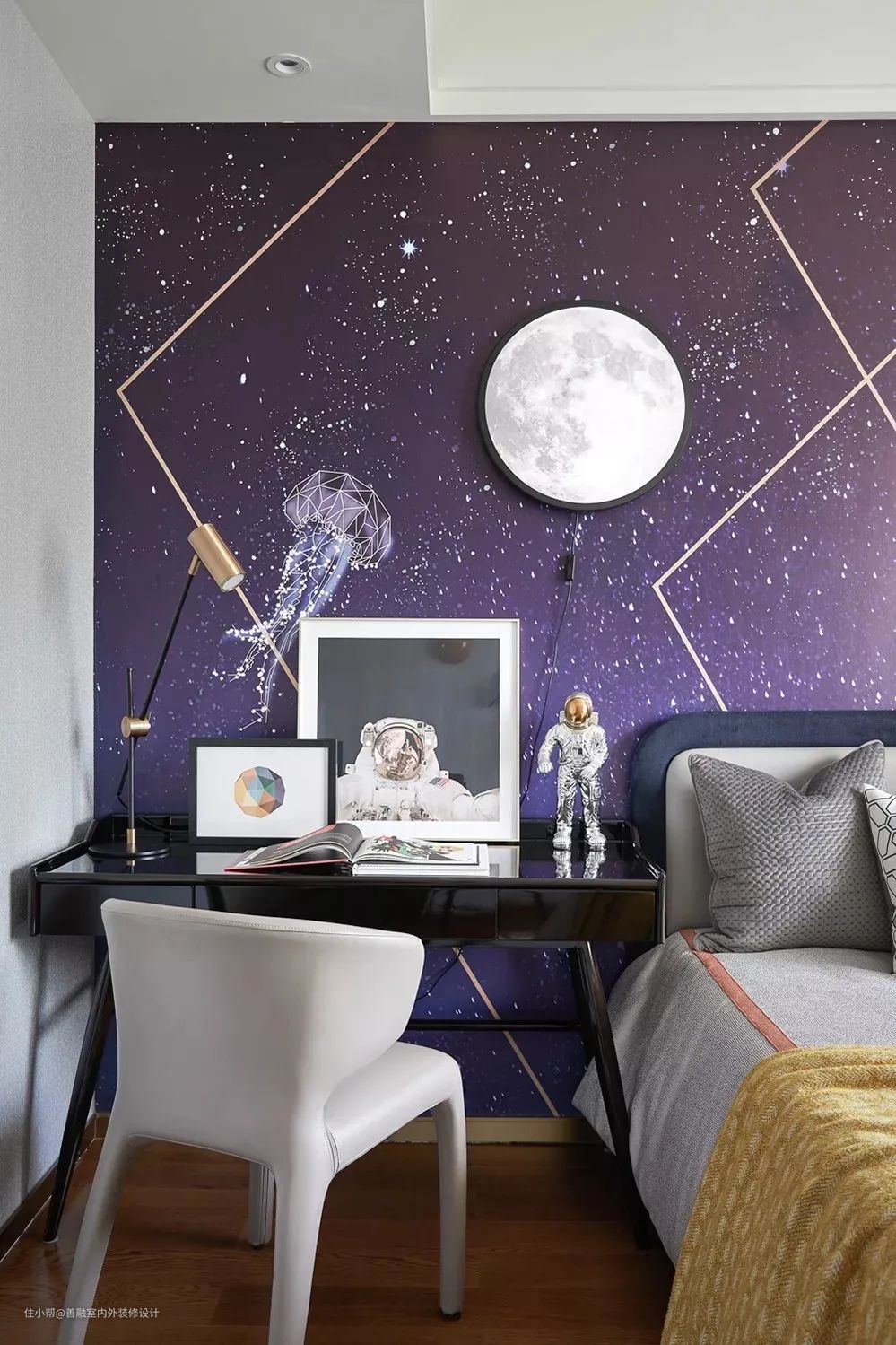 ▲儿童房以太空为设计主题,床头墙是一幅星空、月球与星座组合的画面,布置上太空主题的软装摆设,呈现出一种深邃而童趣气质。