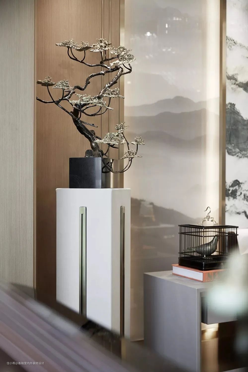 ▲角落处的摆饰品,是中式意境的盆景装饰,布置在空间里,也给人以精致的禅意气息。