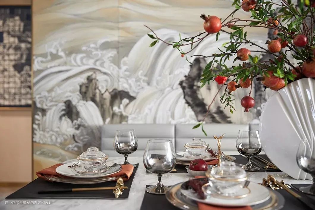 ▲餐厅背景墙延续了客厅沙发墙的东方意韵,以诗意情趣的图案搭配,布置上精致的餐具器皿与花瓶,也营造出一个令人陶醉的用餐氛围。
