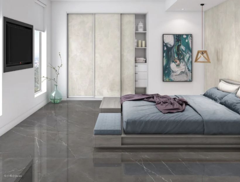 在卧室的设计上,设计师在征求了我和先生意见之后,在空间和光线上做了较大尺度的布局。选用彼特拉灰做地砖配合白墙面, 岩板的灰度、光感、触感、纹理,再配合上家人都喜欢的软床,别致吊灯,空间感十足,同时也更有层次,在居室更有温馨感。