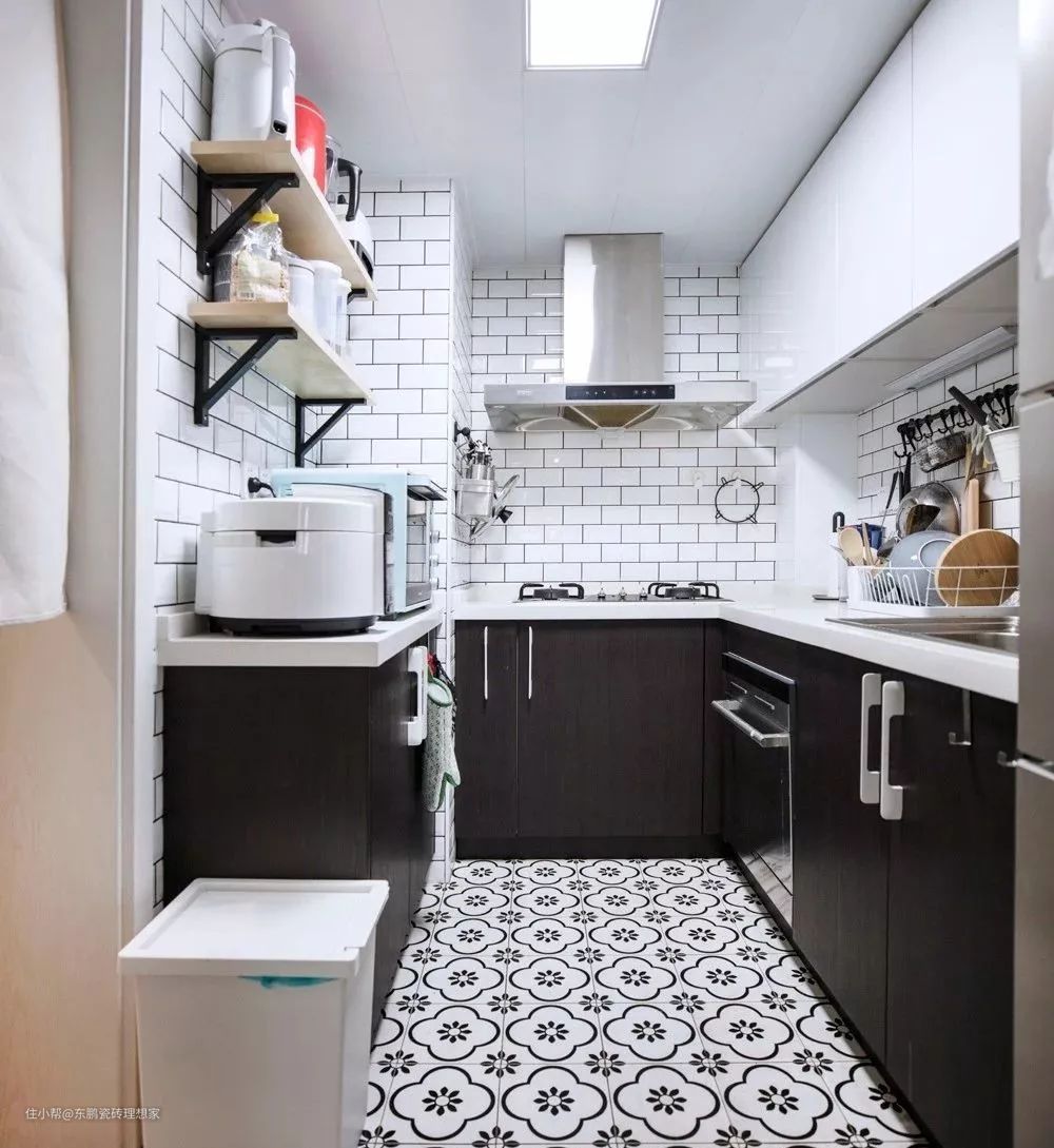 实际应用中,可以根据户型大小、采光条件进行黑白色的比例分配,小户型可墙面使用小白砖,地面使用黑色瓷砖,能很好的改善采光效果。