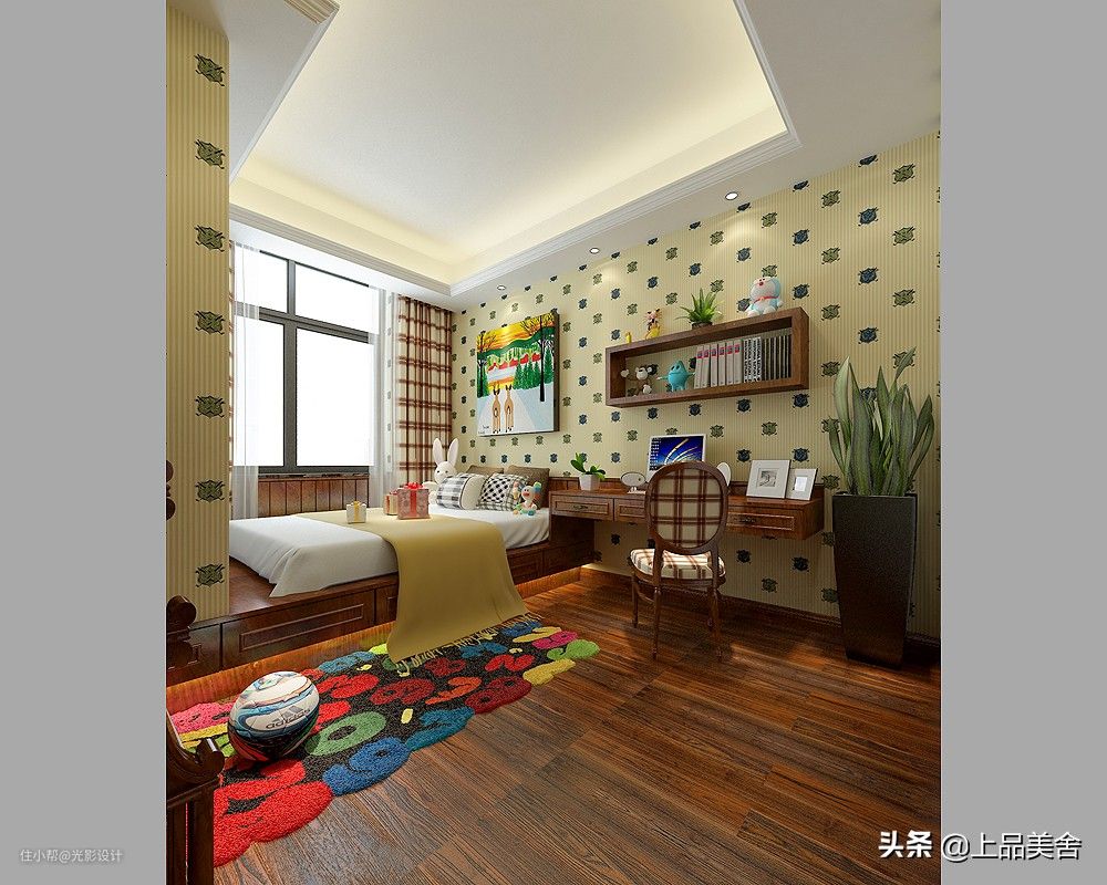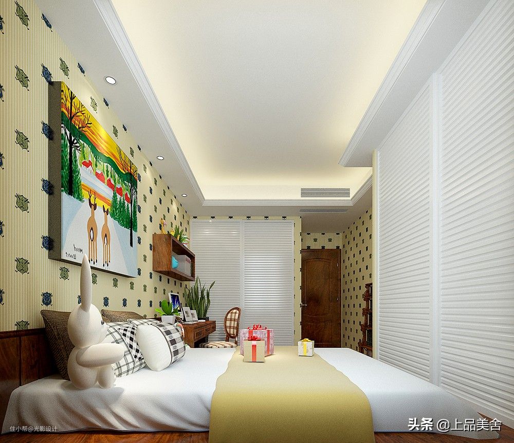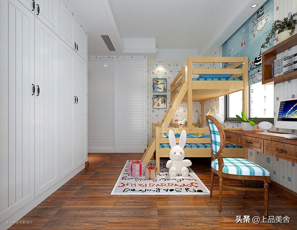 这个小孩房标记为小孩房2,采用的是上下铺床,和小孩房1一样都选择的卡通墙纸,方便以后更换。