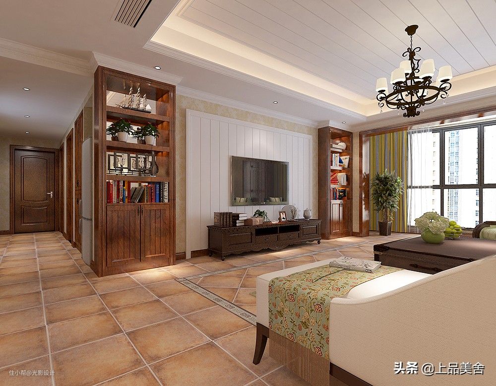 客厅的电视背景墙和吊顶做了很好的搭配,都采用石膏板抽缝的设计处理,电视墙两边的原木储物柜,为了让其显得不太沉闷,所以用白色点缀一下,显得轻快一点。美式的厚重,给生活增添了几分的品味,美式的对称,精致有仪式感。