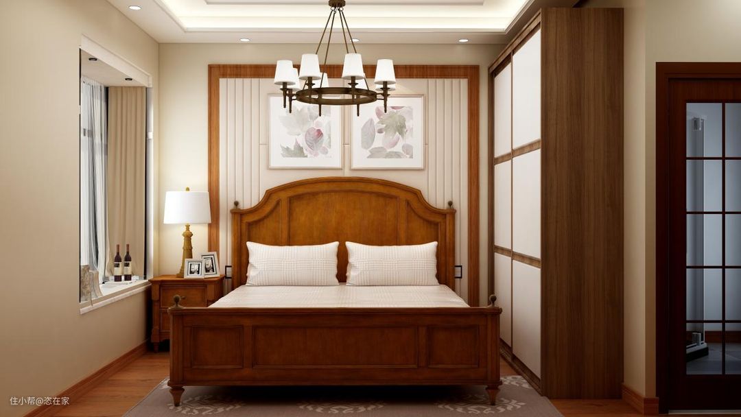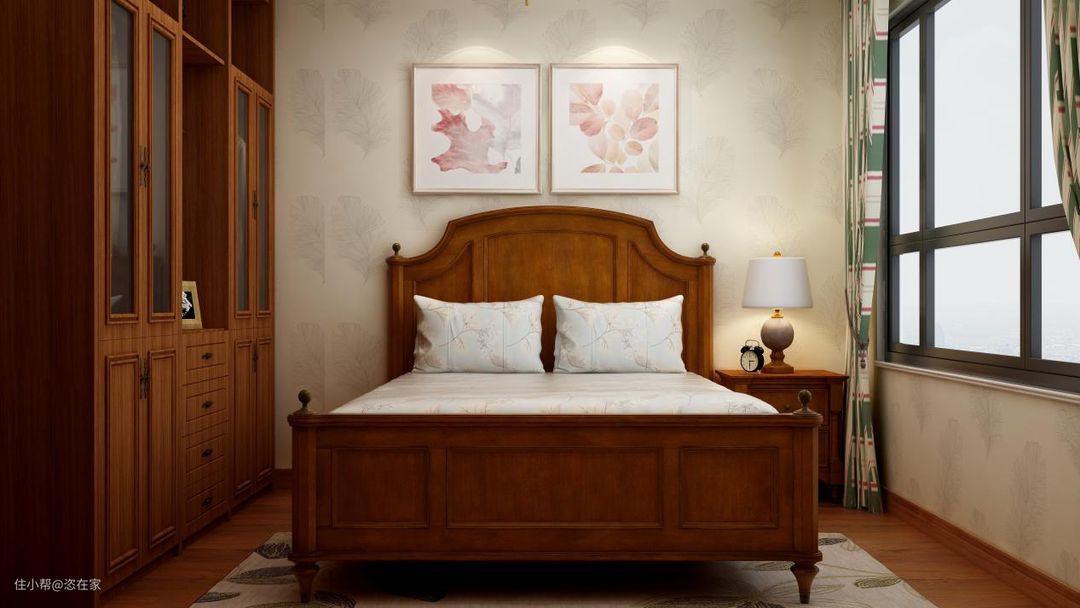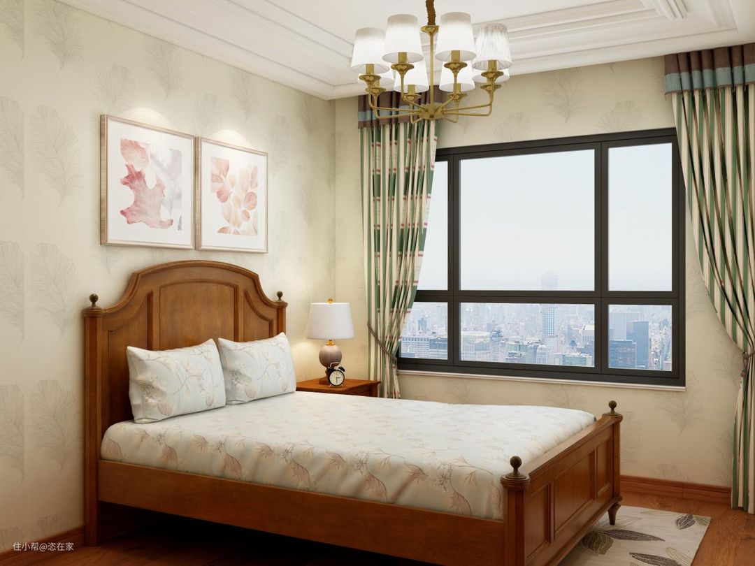 卧室是私密空间,装修上应该更加遵从内心。单一的深棕色美式床,造型复古耐看,配上绿色格子的窗帘,显得清新不少。