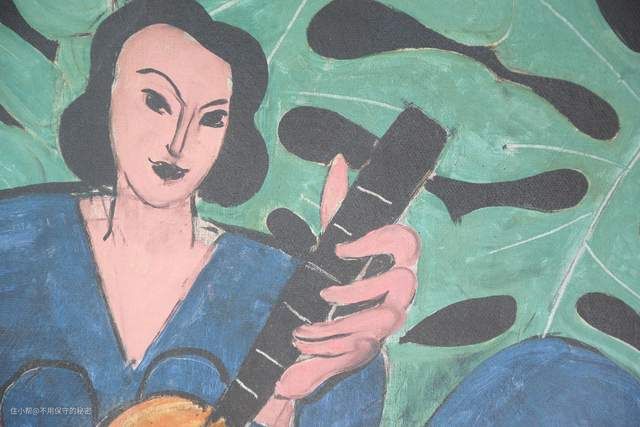 我被抱吉他的女孩吸引了,这幅画是亨利·马蒂斯1939年创作,现藏于奥尔本赖特诺克斯美术馆(Albright-Knox Art Gallery, Buffalo, NY, US)。画面上两个女孩,一个抱着吉他,像是在唱歌,另外一个坐在旁边,像是在聆听。绿色的龟背叶,红色的墙,加上黄色与蓝色的长裙,整幅画大量的使用了对比色,非常有视觉冲击力。