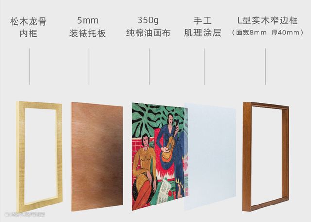 虽然这幅抱吉他的女孩是衣服复刻作品,但采用超清复刻画芯,纯棉油画布手涂专用塑形膏,完全原汁原味的还原了亨利·马蒂斯大师的作品。就连手感都是油画的质感。