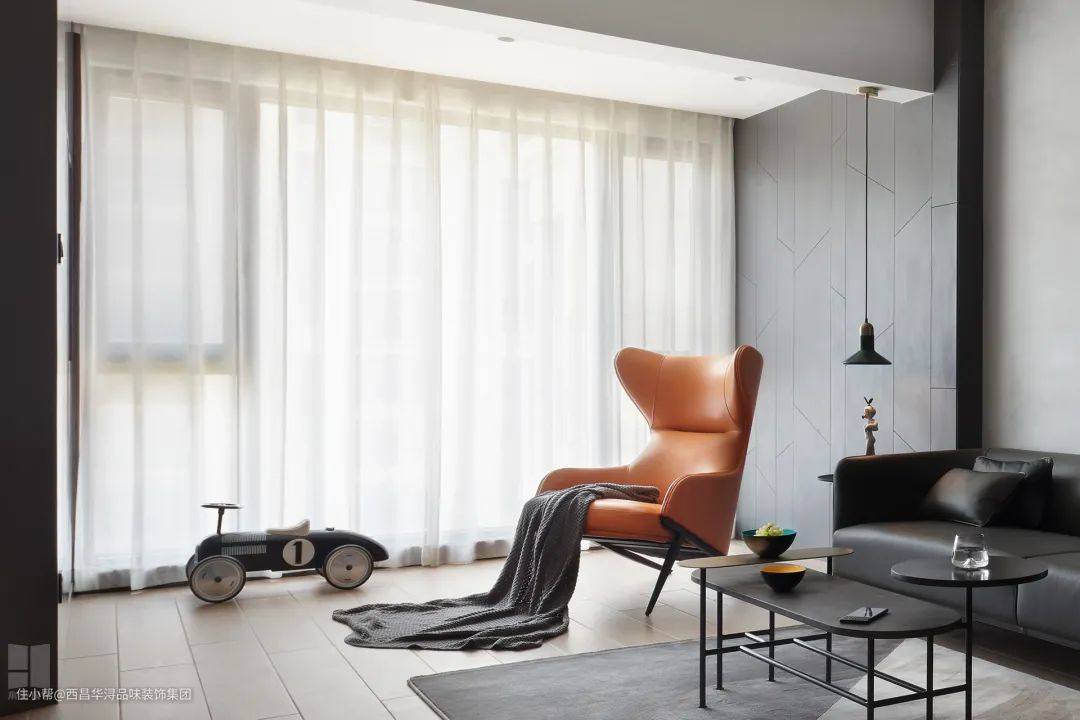 ▲原本的阳台打通后纳入到客厅区域,布置一张橙色的休闲沙发椅,还有小车造型的王珏,在纱帘的光线氛围下,也显得格外的时尚温情而高级。