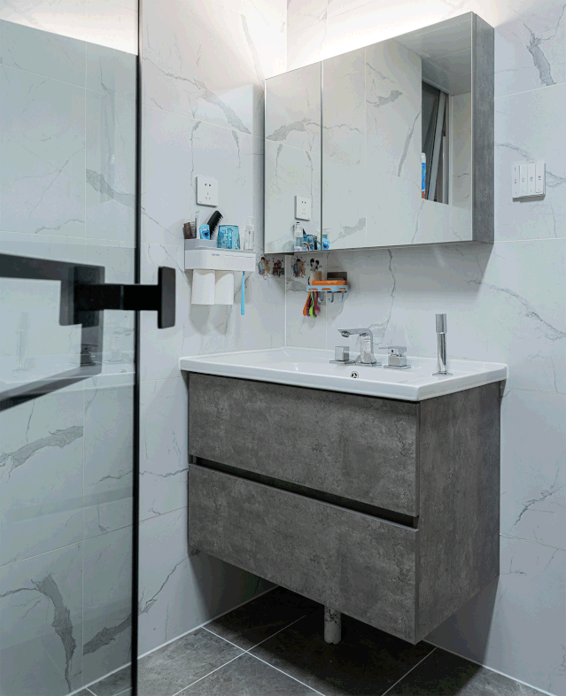 用与浴室柜相同的板材,将管道全方位的包裹起来,在视觉上可以有效的提升美感。