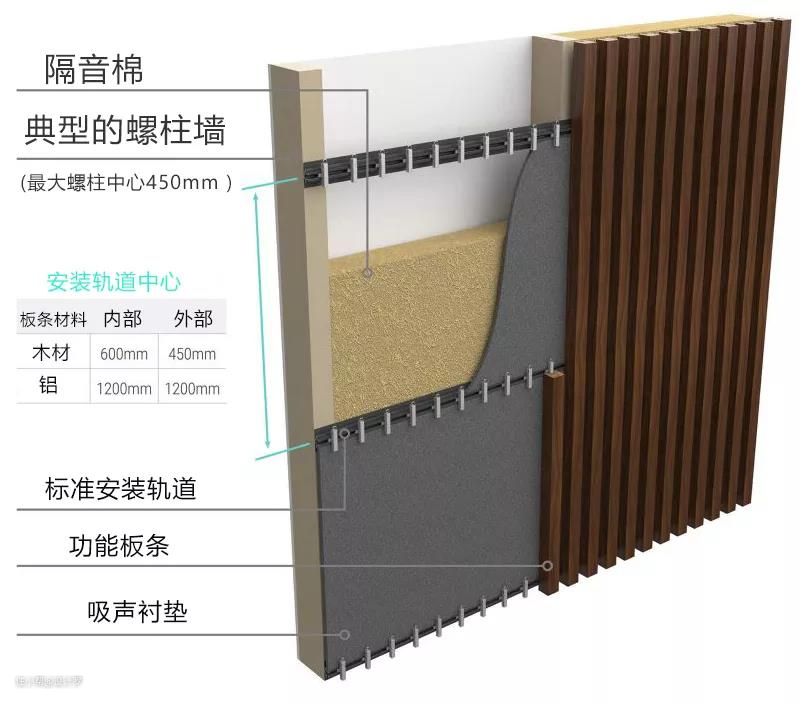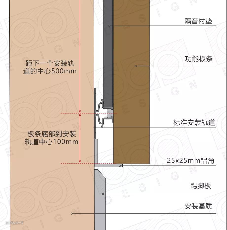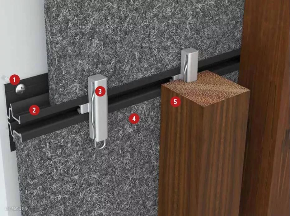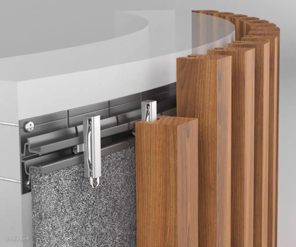 这种高性能、完整的木材覆层系统能够灵活地创建线性纹理和造型,动态的木材表面可以让其适用于多种设计风格,而且可用于吊顶、墙面等任何位置。那在讲这种格栅造型设计的安装工艺前,咱们先来分析在它的构造是怎样的,从构造图可以看出结构分为5部分。