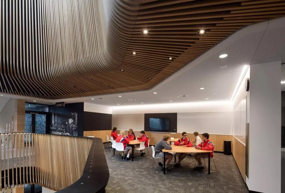 那大家就会有疑问了:这种大面积的使用木材饰面,防火等级能达到吗?墙面还好,像图中这种设计怎么施工?作为功能结构,承重和强度能够达到吗?怎么检修?等等。接下来,咱们就从这种条形设计出发,来讲解它所采用的材料和施工工艺,主要解决以下问题: