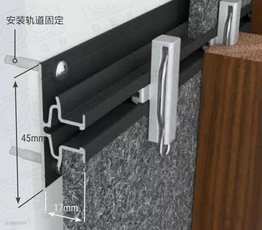 标准轨道的尺寸是宽45mm x深17mm,长度根据项目而定。标准安装轨道室内和室外都适用,有专门的凹槽设计安装便捷,加上隔音背衬会有更好的隔音效果。