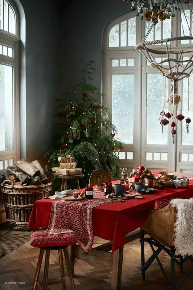 浪漫的圣诞大餐离不开红红火火的桌布点缀,同时,制造一个边用餐边观赏的“圣诞角”是最佳选择。▼