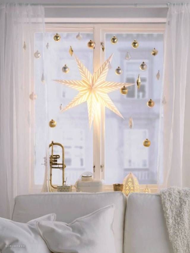 窗的装饰可以用装饰球、串灯、雪花贴纸来完成。暖暖的灯光与金色饰品交相辉映。▼